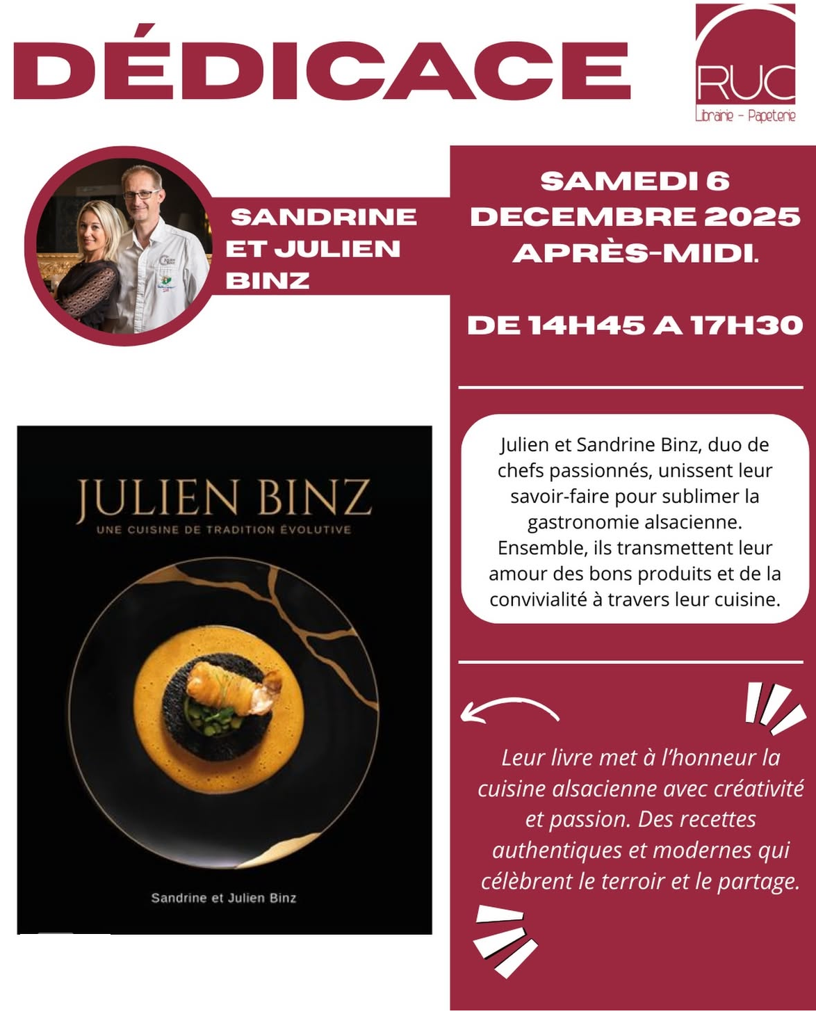 Julien et Sandrine Binz dédicaceront l’ouvrage Julien Binz, une cuisine de tradition évolutive samedi 6 décembre de 14 h à 18 h, à la librairie RUC, place de la Cathédrale à Colmar.