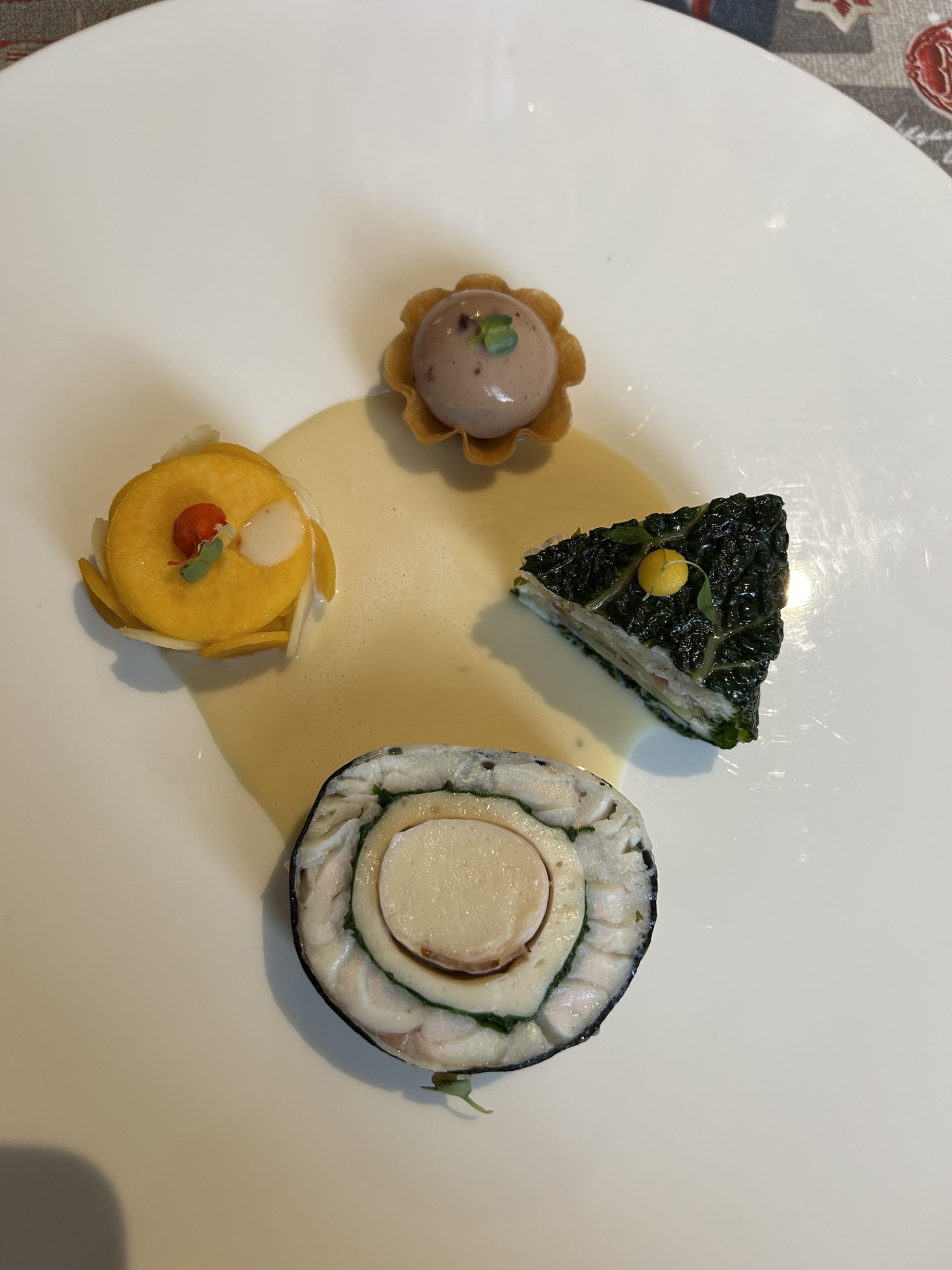 Le chou vert “fil d’or” de la Choucrouterie Ades, associé à la pomme de terre Agria et assaisonné au raifort frais, propose une évocation assumée de la choucroute, à la fois lisible et contemporaine. La composition est complétée par une tartelette de topinambour, rôtie au beurre noisette, dotée d’un cœur crémeux légèrement cacaoté, qui renforce la profondeur aromatique du tubercule.