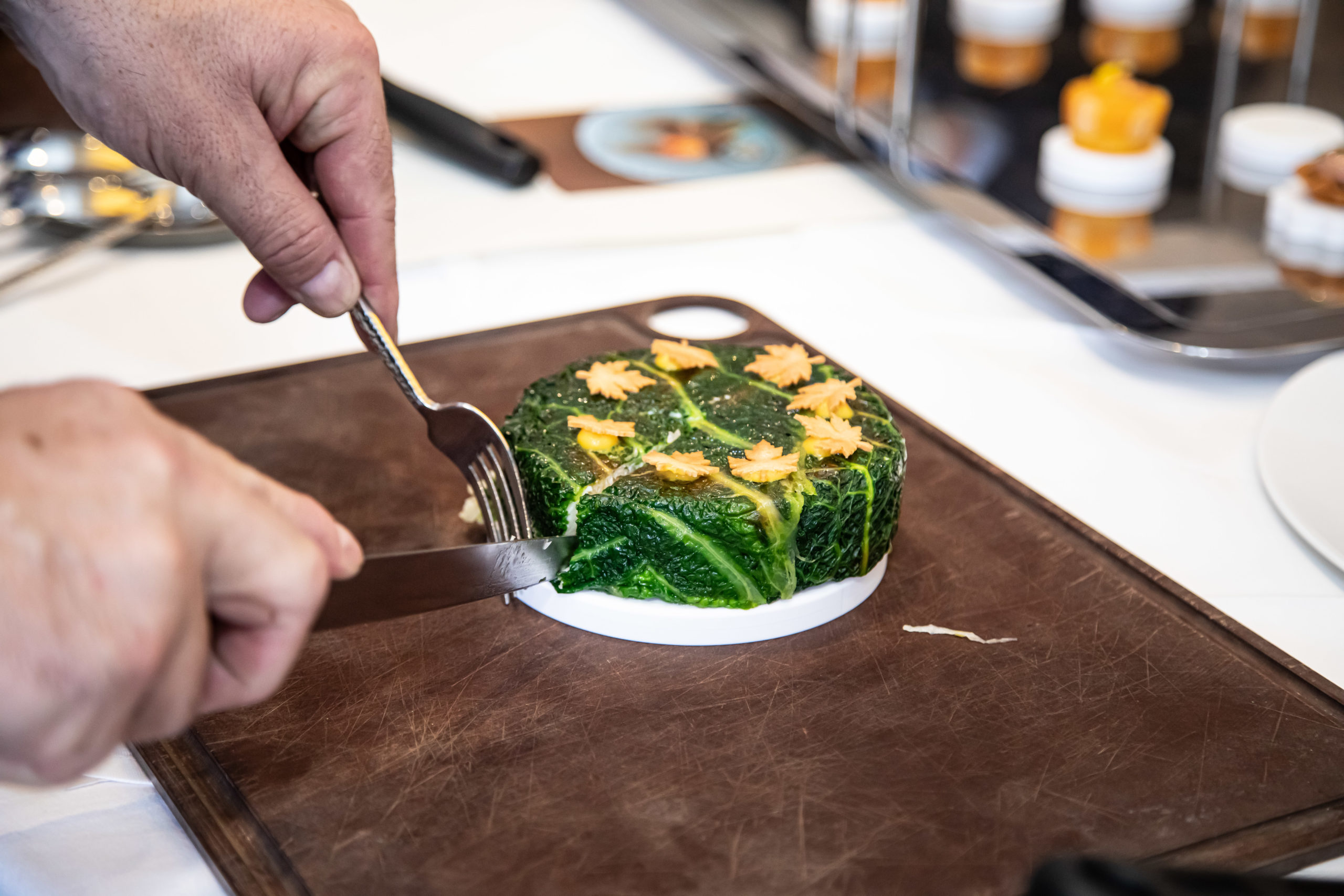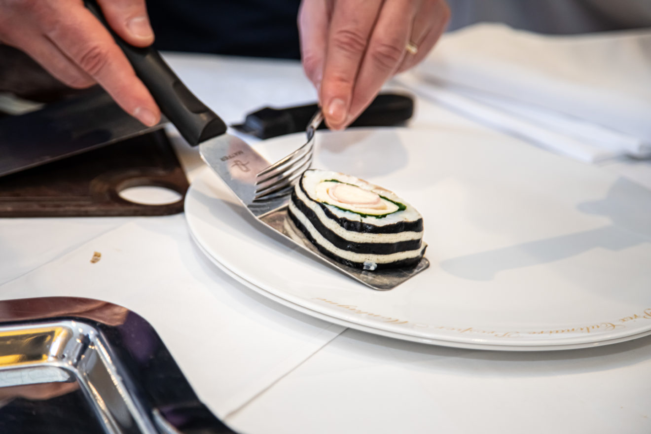 Pour le thème imposé autour du sandre et de la choucroute, Alexandre Zoccolan a choisi une lecture personnelle, profondément ancrée dans son terroir alsacien. Il présente une ballotine de sandre, encylindrée d’une farce fine de sandre, relevée d’épinards juste tombés, apportant fraîcheur et équilibre. Le jambon fumé de Forêt-Noire structure l’ensemble par sa salinité et sa note fumée.