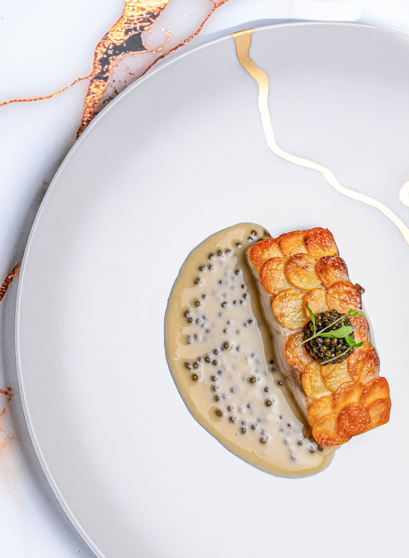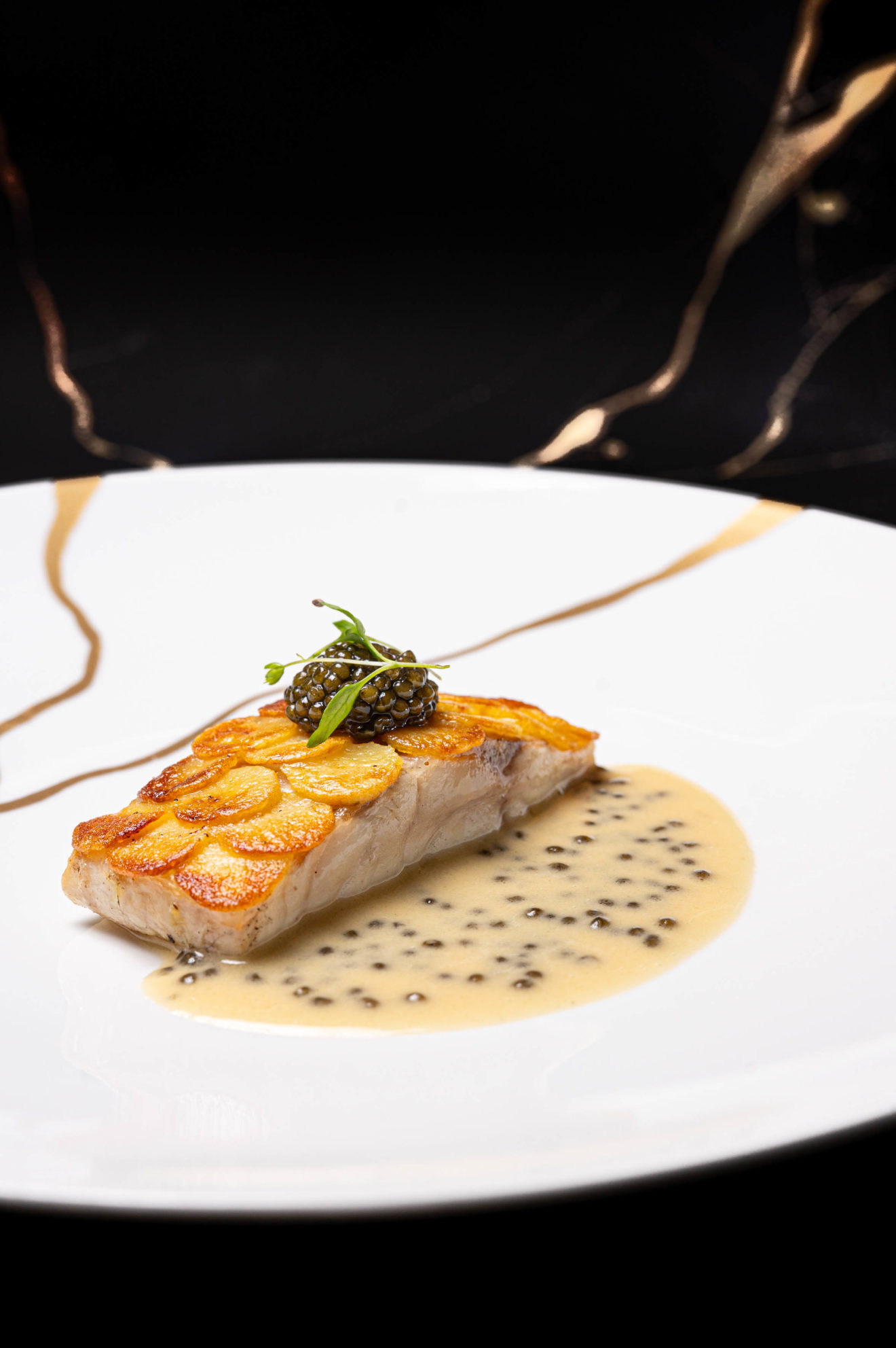 Filet de bar de ligne en écailles de pommes de terre, caviar Transmontanus de la maison Kaviari