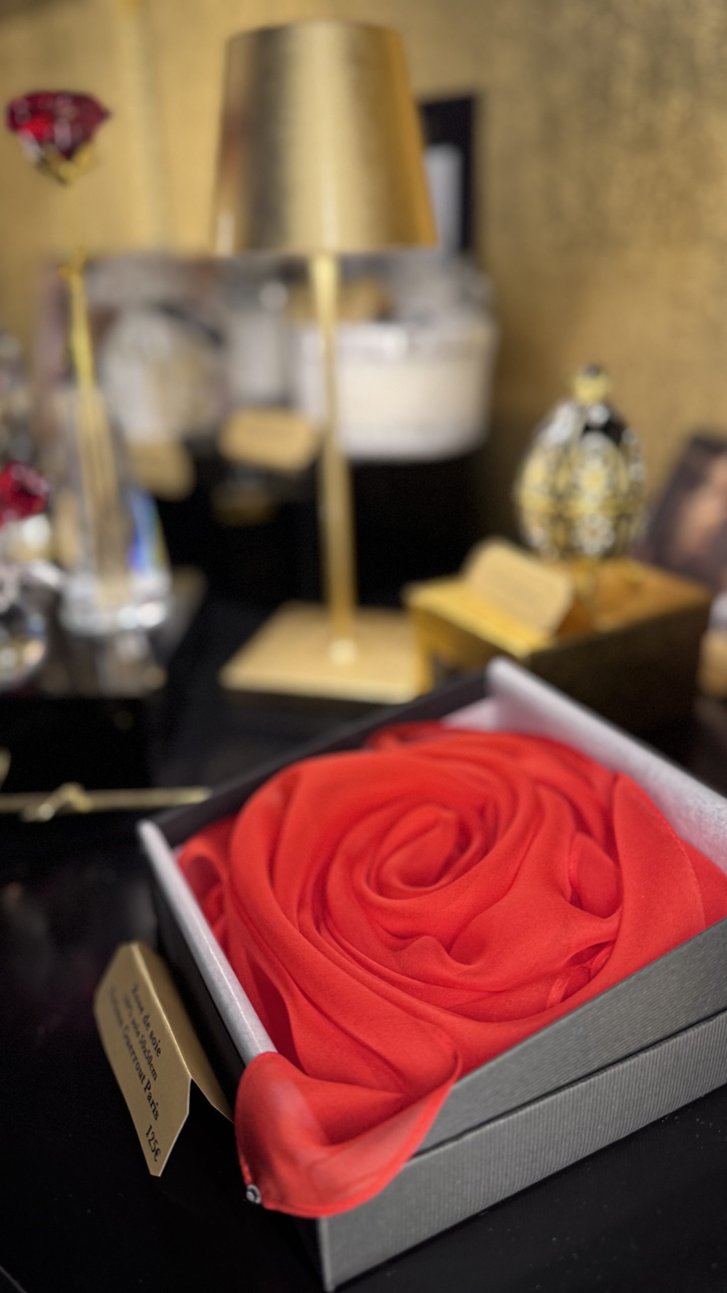 Le rouge se décline également à travers des coffrets, des objets de table, des bouteilles choisies avec soin, des bougies et des bouquets d’intérieur qui prolongent l’atmosphère feutrée du restaurant. Chaque pièce a été sélectionnée pour porter une part de cette élégance discrète que l’on retrouve à table.