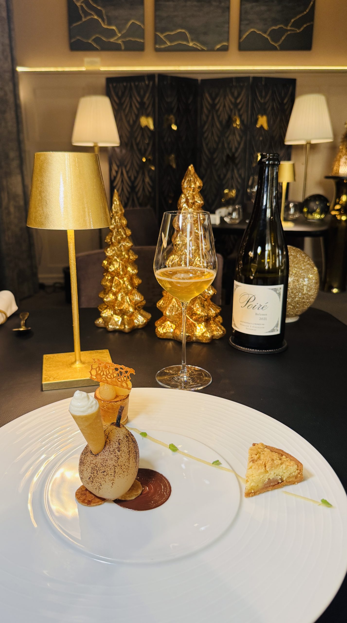L’accord avec le Poiré Bélénos 2021 de Johanna Cécillon, prolonge cette partition avec justesse. Extra-brut, sans sucre ajouté, ce pétillant naturel 100 % poire apporte une fraîcheur vive, une minéralité nette et une bulle fine, qui viennent équilibrer le miel et souligner la pureté du fruit. Plus qu’un simple accompagnement, il agit comme un révélateur, tendant l’ensemble et allégeant la finale.
