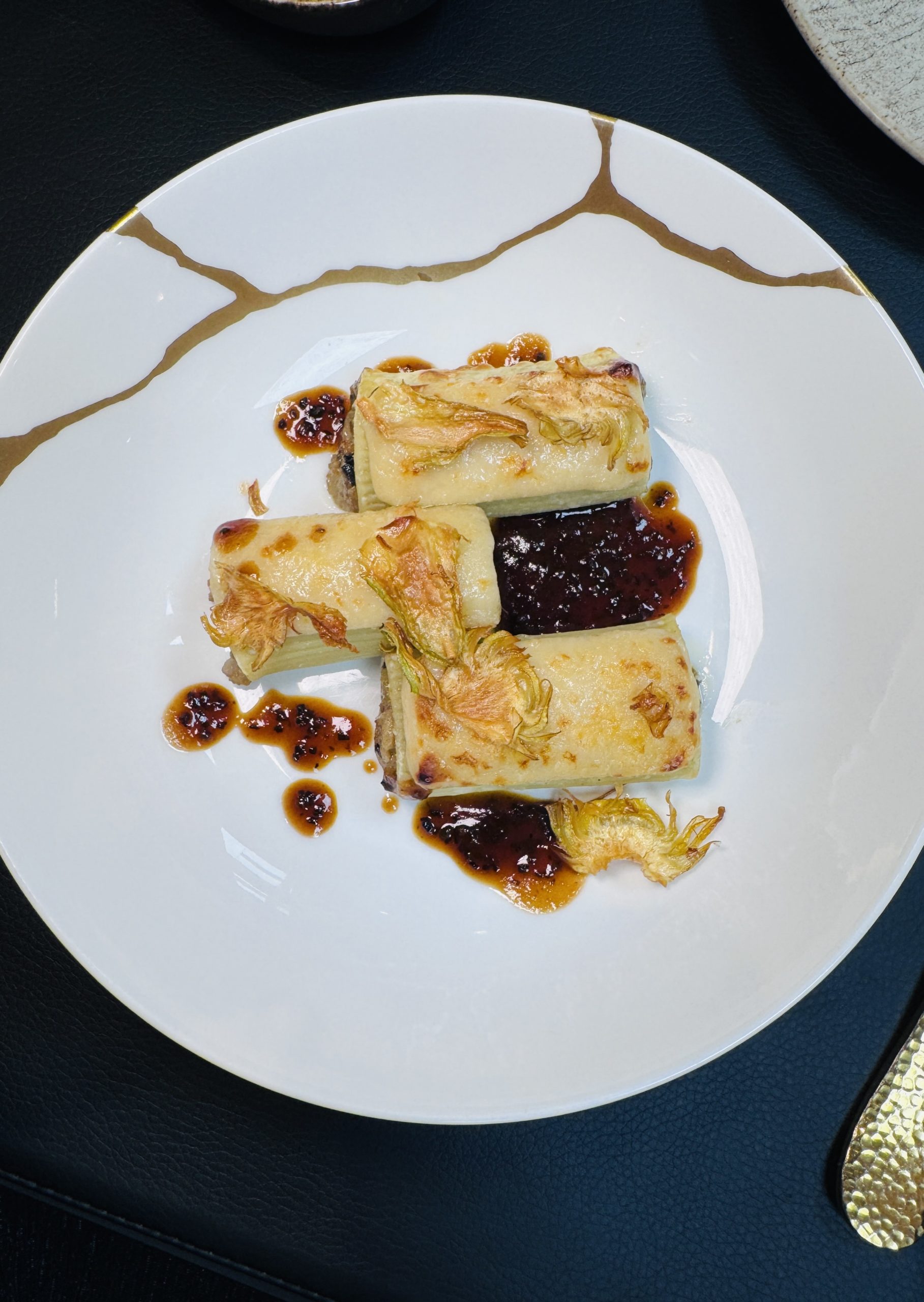 Le second service change de registre et assume pleinement une dimension plus généreuse. Les rigatoni deviennent le support d’une farce associant artichaut, foie gras et truffe. Les pâtes sont nappées d’une sauce mornay (béchamel enrichie de gruyère) avant d’être gratinées. Au four, la surface se transforme en une croûte dorée, légèrement croustillante, qui contraste avec la texture fondante de la farce. Pour accompagner ce gratin, une sauce périgueux. Élaborée à partir de porto rouge et de truffe, elle apporte une profondeur aromatique caractéristique de la grande tradition gastronomique française. Sa richesse enveloppe le plat et souligne la présence du foie gras. Là où la timbale de spaghetti privilégiait la légèreté, ces rigatoni gratinés offrent une sensation de confort et de générosité. Les textures deviennent plus riches, les saveurs plus enveloppantes.