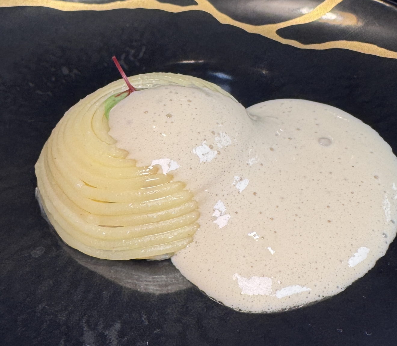 Le premier acte se présente sous la forme d’une élégante timbale de spaghetti. Les pâtes, délicatement dressées en dome, sont enveloppées d’une farce mousseline subtilement parfumée à la truffe. Au cœur de cette timbale se glissent deux ingrédients qui structurent le plat : les trompettes de la mort et les ris de veau. Les champignons offrent leurs notes forestières, tandis que les ris de veau apportent une profondeur charnue et délicate. Le tout est accompagné d’un sabayon à la truffe. Sa texture légère et mousseuse vient napper le plat d’une onctuosité aérienne. L’ensemble reste d’une grande finesse : la truffe s’exprime sans jamais dominer, laissant les saveurs se répondre avec subtilité. Ce premier service joue la carte de l’équilibre. La richesse des produits est contenue dans une structure légère, presque aérienne, qui prépare le palais à la suite.