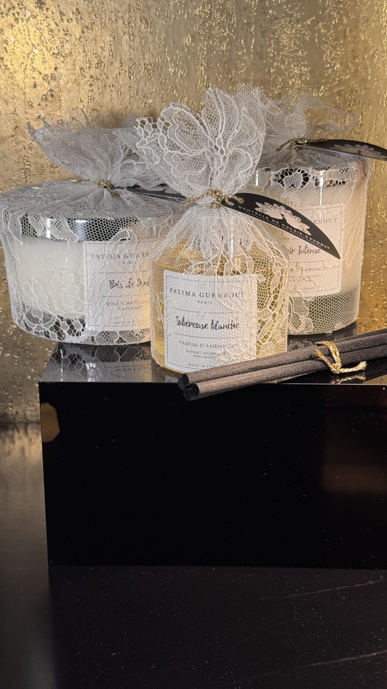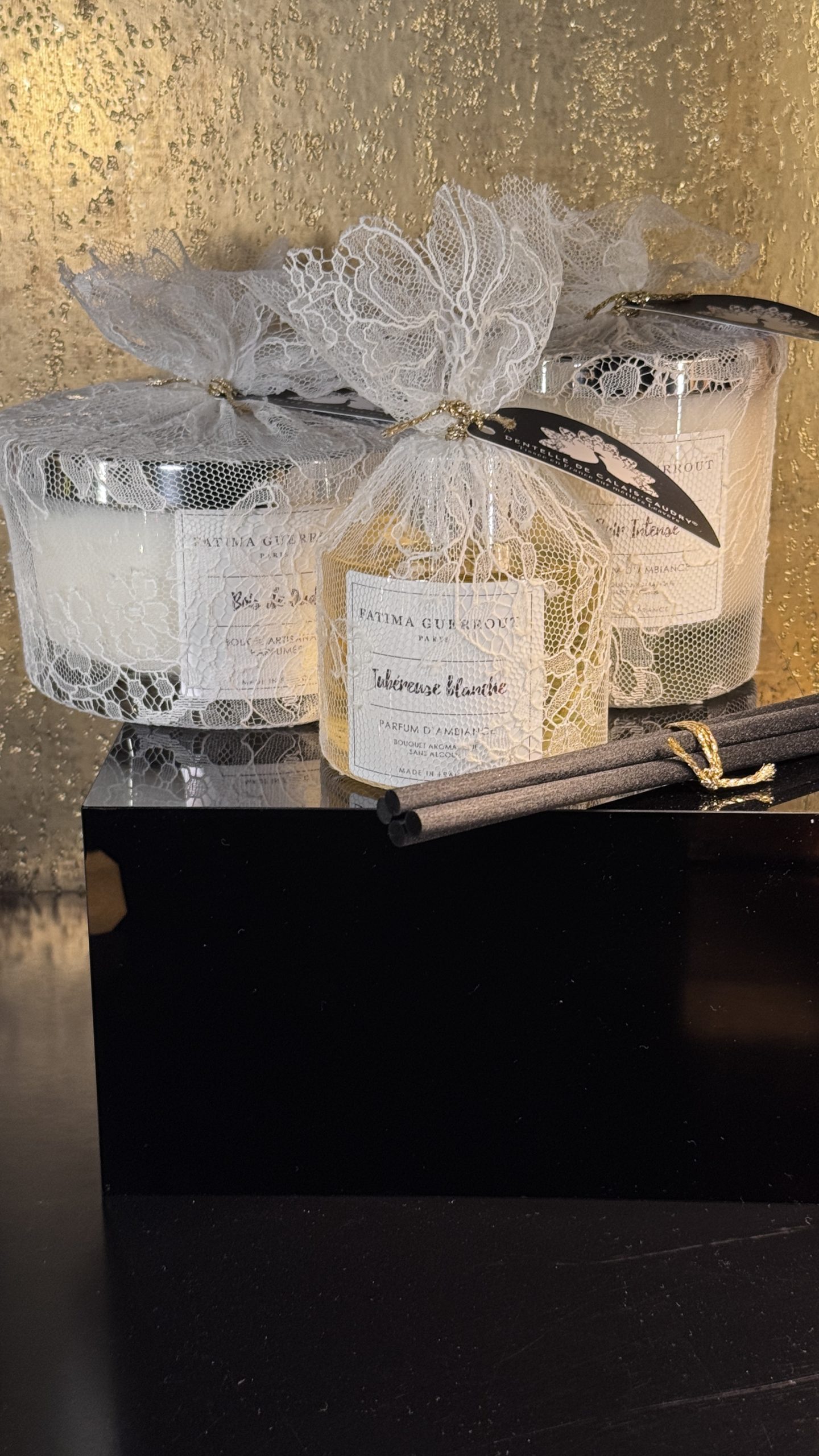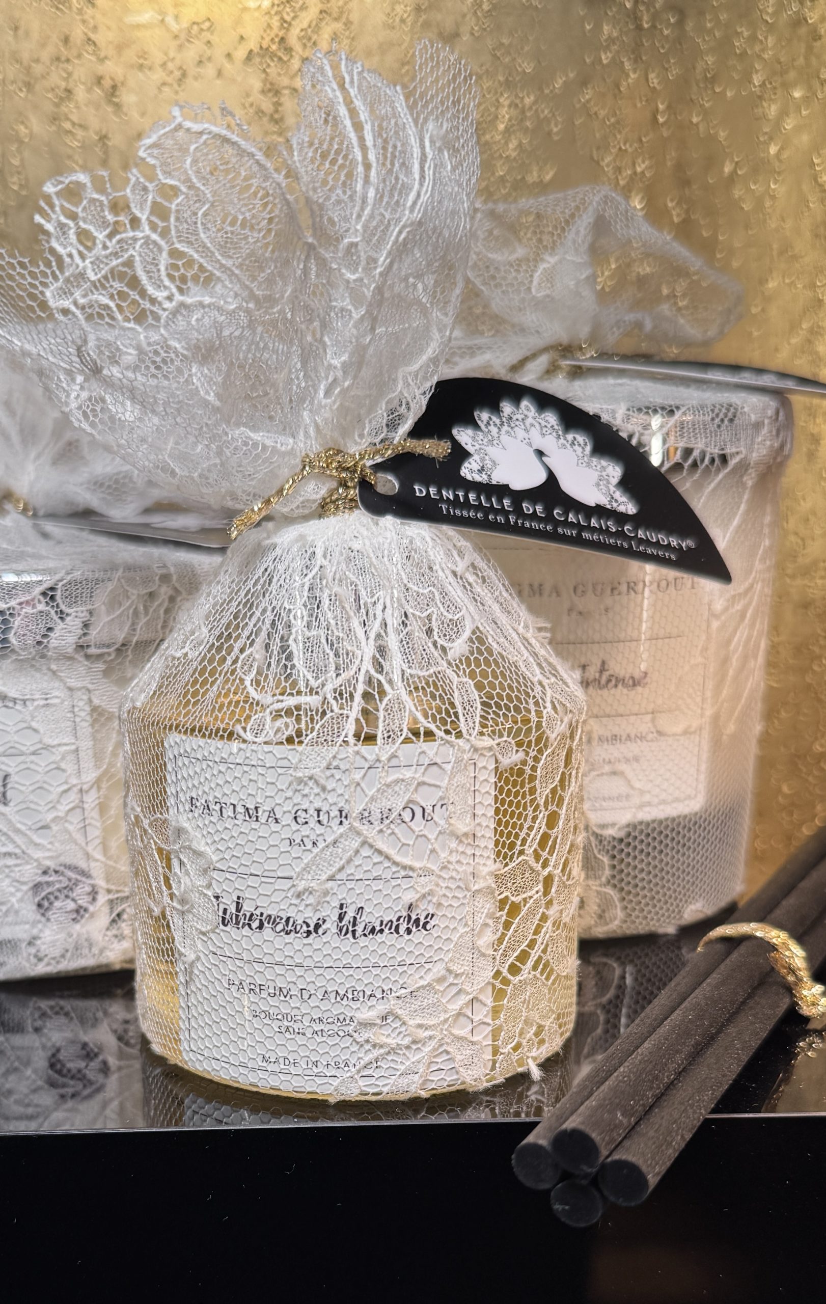 Bougies et diffuseurs sont présentés dans un écrin habillé de dentelle Leavers de Calais-Caudry, symbole de savoir-faire et de patrimoine textile français, faisant de chaque pièce un véritable objet décoratif. Des créations olfactives imaginées en Alsace, où le parfum devient un art de vivre, à la fois discret, sensoriel et profondément élégant.